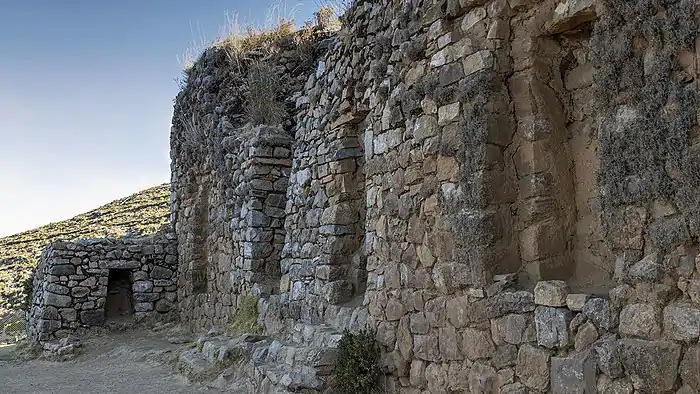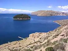 ![]() Pillkukayna with Lake Titicaca, the strait of Yampupata and Chelleca island in the background | |