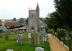 The first records of Pimperne are in Domesday Book in the late 11th century, where it is recorded as "Pinpre",[2] but it is believed that the village goes back to Anglo-Saxon times. A Bronze Age settlement was discovered in the barrows to the north of the village. A house found there has been used as the model for all Bronze Age houses, including the reconstruction at Butser Ancient Farm, Hampshire. The parish church of St Peter was rebuilt by Lord Portman of Bryanston in 1872–4, though some Norman features from the previous building, such as the font and chancel arch, were retained.[2]