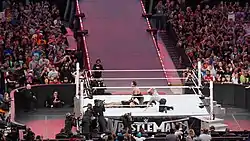 The Undertaker pinning Bray Wyatt with his signature variation pinfall crossing the opponent's arms across their chest after his finishing move, the Tombstone Piledriver, also called the "Rest In Peace" pin.