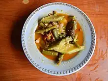 Ilocano cuisine is characterized by dishes that are either salty or bitter, requiring rice.[3] Original Ilocano pinakbet is seasoned with bagoóng of fermented fish (buggúong nga ikán) usually of anchovies (munámon). The dish includes bitter melon (paría).[4] These two ingredients define the inclinations of the Ilocano palate.[3][5][6]