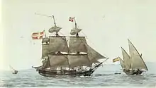 In the Atlantic Ocean the word pink was used to describe any small ship with a narrow stern, having derived from the Dutch word pincke meaning pinched. They had a large cargo capacity, and were generally square rigged. Their flat bottoms (and resulting shallow draught) made them more useful in shallow waters than some similar classes of ship. They were most often used for short-range missions in protected channels, as both merchantmen and warships. A number saw service in the English Navy during the second half of the 17th century. In the 1730s pinks were used in cross-Atlantic voyages to bring Palatinate immigrants to America.[2]