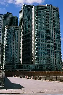 Pinnacle Centre is a condominium tower complex in Toronto, Ontario. The complex consists of four towers located on former railway lands on the Toronto waterfront. It is one of a number of new condominium projects in the area, the most notable being nearby Maple Leaf Square and CityPlace developments to the west. The Pinnacle Centre site is bounded by Yonge Street to the east, Harbour Street to the south, Bay Street to the west, and the Gardiner Expressway to the north. It was built by Vancouver−based Pinnacle International. It has 1,880 residences on approximately 3.8 acres of land.