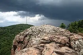 HA-67 was a Nike 1B defensive missile base which operated from 1956 through March 1961 on the Plainville side of the rock near Loon Lake, southeast of the summit. The base is no longer in existence, with little remaining other than a parking lot and a few buildings which have been reduced to rubble.[1] Further southeast is a small (0.4 mi/600 m wide) traprock quarry.