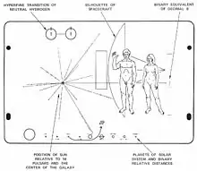 Pioneer 10 and 11 both carry a gold-anodized aluminum plaque in the event that either spacecraft is ever found by intelligent lifeforms from other planetary systems. The plaques feature the nude figures of a human male and female along with several symbols that are designed to provide information about the origin of the spacecraft.[42]