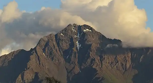 Pioneer Peak (Ahtna: Tnel'aay; Dena'ina: Dnal'iy) is a 6,398-foot (1,950 m) mountain in the Chugach Mountains in the U.S. state of Alaska. Located beside the Knik River just nine miles (14.5 km) south of Palmer and about six miles outside the Municipality of Anchorage limits, it is a prominent landmark in the Matanuska-Susitna Valley, as well as a popular hiking destination. Its Ahtna name means "the object is standing still" and its Dena'ina name means "the one that watches us".[3] The name was given in 1939 in honor of the pioneers of the Matanuska agricultural colony of the mid-1930s.[2] The Pioneer Ridge Trail leads up the eastern shoulder, beginning below 200', it allows access to the South summit. The North summit, and true summit of Pioneer Peak does not have a trail, and advanced mountaineering techniques are required. The first ascent of this peak was made June 1936 by Vernon Haik and John Wolffe via the Northwest Face.[4]