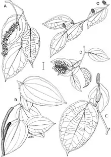 Piper fungiforme is a root climber with a maximum stem diameter of 2 cm (0.79 in).[4] The leaves are ovate to narrowly ovate, measuring up to 14 cm (5.5 in) long by 5 cm (2.0 in) wide.[4][5][6] The apex is acuminate and the base cuneate and asymmetric.[4][5] There are 2 or 3 pairs of lateral veins, all of which divert from the midvein in the basal portion of the leaf.[4][5]