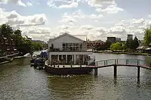 The ait is the third-smallest of those named on official maps of the Thames.[1] Maps show it has clearly approximately kept its footprint measurement of 0.147 acres (590 m2) shortly before the year 1900, though the few rounded corners of its then-boathouse use have been neatly squared since the restaurant's opening.[2] It is accessed on foot by a footbridge and staircase (also known together as a gangway) that connects the island to the centre of Caversham Bridge. The smallest island with vehicular access on the river is almost double its size, Swan Island, London which is in Twickenham.[3][4][5]