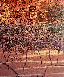 This glaze and lustre period reached its apogee in the Pakistan series, where multiple, liberal layers of glaze were followed each time by dousing in paraffin wax, scraping back, and filling.[4]