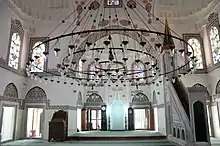 The mosque is situated in the middle of a courtyard on a terrace.[1][2] Built in ashlar,[2] it has a square plan form topped with a lead-sheet covered dome of 11.90 m (39.0 ft) diameter. It has two lines of windows, the upper line windows are in pointed arch form and the ones below have rectangular form. The mihrab, situated in a stem, which is topped by a half dome, opens to the main prayer room by a large pointed arch. On two sides of the main prayer room, there are two domed cells, which have doors to the outside and the inside. Both cells have a window opening to the outside in the south, and a window opening to the narthex in the north.[2] The mosque features a narthex with five pointed-arch spacings in front of the main entrance. The five domes of the narthex are carried by four columns with muqarnas capitals. The middle narthex dome is higher than the others. The narthex is flanked by walls with a window on both sides.[2] The interior of the domes, arches, walls and particularly around the windows are decorated with hand-drawn figures. The interior of the main dome features the Quran vers ʾĀyat al-Kursī ("The Throne Verse"). The mosque has one minaret with a single balcony in the northwest, which is accessible from th mosque's inside. The minaret's base is original while the tower was re-built during the renovation works of the mosque complex, which were commissioned by the trustee Sâdeddin Bey and took place 1179 AH (1765–66), according to an inscription situated on both sides of the main gate.. In the middle of the courtyard, there is an octagonal shadirvan with pyramidal roof covered by zinc sheet. It was built during the restoration works of 1966–1971.[2]
