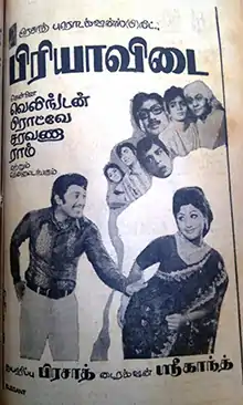 Piriya Vidai[needs translation] is a 1975 Indian Tamil-language drama film directed by Srikanth and produced by L. V. Prasad.[1][2][3] Starring R. Muthuraman and Prameela, it is a remake of the 1970 Telugu film Thalla? Pellama?. The film was released on 15 August 1975 and failed commercially.