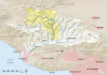 The creek drains an area of about 497 square miles (1,290 km2), making it the Santa Clara River's biggest tributary in terms of watershed size.[4] Most of the creek above Lake Piru is located in the Los Padres National Forest. There are two major reservoirs on Piru Creek, Lake Piru and Pyramid Lake, which respectively store water for local irrigation and the California State Water Project.