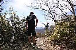 ![]() View from Black Mountain Trail in Pisgah National Forest. Mountain bikers take a break near the summit of Black Mountain. |