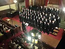 The University of Pittsburgh Men's Glee Club (also known as the Pitt Men's Glee Club or PMGC) is an internationally recognized men's choir of students at the University of Pittsburgh and is the oldest nonathletic extracurricular group at the University.[1] Founded in 1890 by John L. High, the Glee Club performs at the First Baptist Church of Pittsburgh and normally goes on a concert tour each year, with an international tour every 3rd year.[2] Recently, the Glee Club has performed in areas such as Texas, Philadelphia, New York City, Belgium, France, and a recent 125th anniversary tour of Italy in the spring of 2015.