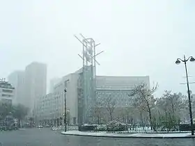 The Italie 13 project, a grand exercise in urbanism, was conceived in the 1960s, and, under this plan, the Place d'Italie represented the center of a district of high-rise towers stretching out along the entire length of the Avenue d'Italie, with the construction of a truly eye-catching tower, taller than the Montparnasse Tower, called the Apogee Tower, on the Place d'Italie itself. The project began with the construction, close to the Place d'Italie, of six inter-related towers, each about one hundred metres tall, but, because of scathing criticism from the Parisian citizenry and lukewarm support from the Giscard d'Estaing government, the effort, for the most part, was abandoned in 1975. Some sort of mast or multi-colored campanile, conceived by Kenzo Tange, is now planned for the plot of land originally expected to be used by the Apogee Tower, replaced, since 1992, by a collection of smaller buildings, an office building, a luxury residential building, as well as the famous audio-visual complex, Grand Écran Italie (Big Screen Italy).