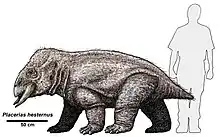Placerias (meaning 'broad body')[2] is an extinct genus of dicynodonts that lived during the Carnian to the Norian age of the Triassic Period (230–220 million years ago). Placerias belongs to a group of dicynodonts called Kannemeyeriiformes, which was the last known group of dicynodonts before the taxon became extinct at the end of the Triassic.