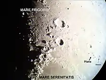 Plana is a lunar impact crater that lies on the boundary between two small lunar mare areas, with Lacus Mortis to the north and the larger Lacus Somniorum on the southern side. It was named after Italian astronomer Giovanni Antonio Amedeo Plana.[1] It is joined to the crater Mason to the east by a short stretch of rugged ground. Due north of Plana in the midst of the Lacus Mortis is the prominent crater Bürg.
