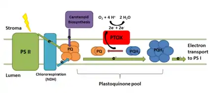 The enzyme is important for carotenoid biosynthesis during chloroplast biogenesis. In developing plastids, its activity prevents the over-reduction of the plastoquinone pool. Knockout plants for PTOX exhibit phenotypes of variegated leaves with white patches. Without the enzyme, the carotenoid synthesis pathway slows down due to the lack of oxidized plastoquinone with which to oxidize phytoene, a carotenoid intermediate. The colorless compound phytoene accumulates in the leaves, resulting in white patches of cells.[3] PTOX is also thought to determine the redox poise of the developing photosynthetic apparatus and without it, plants fail to assemble organized internal membrane structures in chloroplasts when exposed to high light during early development.[1][4]