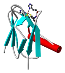 Plastocyanin was the first of the blue copper proteins to be characterised by X-ray crystallography.[3][2][4] It features an eight-stranded antiparallel β-barrel containing one copper center.[3]