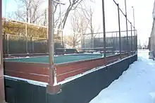 The court is one-quarter the size of a traditional tennis court and is surrounded by a chicken wire fence 12 feet (3.7 m) high. The taut fencing allows balls to be played off the wall and remain in play. Originally developed on land unsuitable for traditional tennis courts, such as along hills, the space under the platform allows for the installation of heating equipment that, together with lighting, can allow for year-long play around the clock, even in cold weather. Courts in warm-weather locations are more likely to be constructed on level ground, as the need for clearing snow and ice is obviated.[7] The deck is 60 feet (18 m) long by 30 feet (9.1 m) in width. The court measures 44 feet (13 m) in length by 20 feet (6.1 m) in width and is divided by a net that is kept taut at a height of 34 inches (860 mm) at its center and 37 inches (940 mm) at either end.[8]