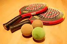 A spongy ball measuring 2.5 inches (64 mm) in diameter is used. The ball can be served overhand. The ball is struck with a paddle that extends 18 inches (460 mm) and which may have up to 87 holes measuring no more than 38 inch (9.5 mm) in diameter to improve its aerodynamics.[8]