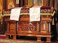 On 1 July 1973, Platon's remains were exhumed and reinterred in the crypt of the Church of the Holy Trinity in Banja Luka, which had been dynamited by the Ustaše during the war and had only recently been rebuilt. In 1998, the Serbian Orthodox Church elevated Platon to the status of hieromartyr.[23] The religious scholar Dimitri Brady argues that Platon was "martyred for [his] ethnic affiliation as much as for [his] religious convictions", and draws a parallel between his murder and that of the monk Father Chariton, who was abducted, tortured and killed by the Kosovo Liberation Army in June 1999.[32] Platon was canonized by the Serbian Orthodox Church on 21 May 2000, in a ceremony held in Belgrade's Cathedral of Saint Sava, together with several other clergymen who had perished at the hands of the Ustaše.[33] His remains were soon disinterred from the crypt of the Church of the Holy Trinity and interred as relics inside a sarcophagus in front of the church's altar. Platon's feast is celebrated annually on 5 May, the anniversary of his death.[23] The historian Vjekoslav Perica argues that Platon's canonization and that of the other clergymen was undertaken in response to Pope John Paul II's controversial beatification of the wartime Archbishop of Zagreb Aloysius Stepinac in October 1998.[33][lower-alpha 3]