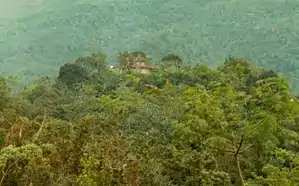 Plawangan vulcanology/observation post in 1985, forested slopes of Mount Merapi at rear