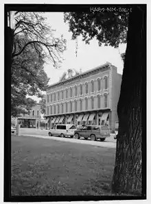 By 1882 the town's population had grown to six thousand.[2] The Plaza Hotel was built that year by a group of businessmen led by Don Benigno Romero.[3] The local merchant Carlos Blanchard was among the partners.[4] Construction cost $25,000.[5] The Plaza is a three-story brick building with an Italianate facade.[3] The hotel was grandly decorated, with high-ceilinged guest rooms. The lobby was connected to the second floor by towering twin staircases.[6] The first floor balcony had ornate iron railings, since removed.[7] It was advertised as the finest hotel in the territory.[8] The Plaza was often called the "Belle of the Southwest".[3]