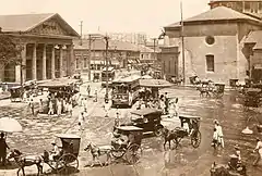 Prior to World War II, Plaza Lacson was considered the heart of Manila,[1] and constituted part of the city's downtown area, which also included Plaza Santa Cruz, Rizal Avenue and Escolta Street. Commercial activity shifted to here from Binondo in large part due to infrastructure improvements made during the American colonial period to improve access to the northern half of the city, which were centered on the plaza. These included the completion of the Santa Cruz Bridge in 1902,[2] and the opening of the Manila tram system a few years later, which had its central terminal at the plaza.[3] The area around the plaza was largely commercial, with bars and restaurants that catered largely to American servicemen either visiting or stationed in the Philippines,[4] complementing the luxury stores along Escolta and the theaters around Plaza Santa Cruz.[3]