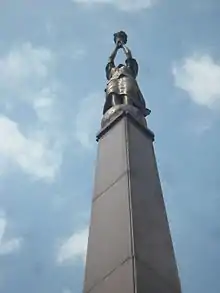 Two of the plaza's four corners contain historical markers. A plaque commemorating the Plaza Miranda bombing in 1971 is installed at the southwest corner, unveiled by President Gloria Macapagal Arroyo on August 21, 2002, while the southeast corner, fronting Quezon Boulevard, has a 35-foot (11 m) high marble obelisk topped by a statue of a woman whose outstretched arms bear a torch, representing freedom. The obelisk is flanked by two columns on each side which are topped with urns made from an alloy of cast iron and bronze, which also serve as gas-fired cauldrons which may be lit for special occasions.[1] The Manila city government declared this particular corner the "Plaridel Corner", after the nom-de-plume of Marcelo H. del Pilar, editor and co-publisher of La Solidaridad, on August 30, 2005, the centenary of del Pilar's death, and the historic plaque, written in Filipino, bears a quotation attributed to the French writer and philosopher Voltaire.