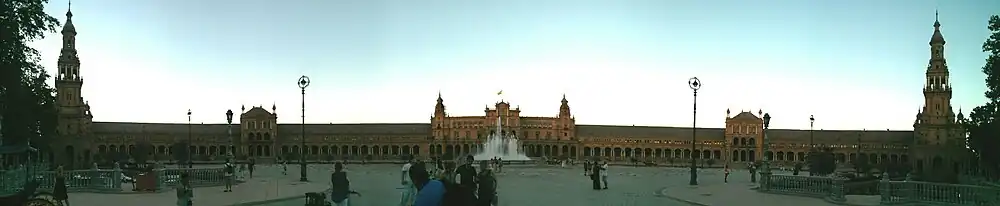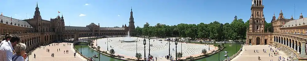The Plaza de España ("Spain Square", in English) is a plaza in the Parque de María Luisa (Maria Luisa Park), in Seville, Spain. It was built in 1928 for the Ibero-American Exposition of 1929. It is a landmark example of Regionalism Architecture, mixing elements of the Baroque Revival, Renaissance Revival and Moorish Revival (Neo-Mudéjar) styles of Spanish architecture.[1]
