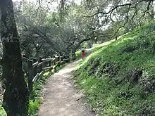 Pleasanton Ridge Regional Park contains over 25 miles (40 km) of trails, most of which are dirt roads, except for the Woodland Trail, the Bay Leaf Trail, and a few sections of the North Ridge and Ridgeline trails. Park elevations range from 400 feet (120 m) at the main entrance to over 1,600 feet (490 m) at the highest point.[6]