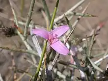 Pleiacanthus is a monotypic genus[1] of flowering plants in the family Asteraceae containing the single species Pleiacanthus spinosus (formerly Stephanomeria spinosa), which is known by the common name thorn skeletonweed, or thorny skeletonweed. It is native to the western United States from Montana and Idaho to southern California and Arizona, where it grows in many types of mostly dry habitat from deserts to mountains. It is a spindly subshrub producing several slender stems up to 40 or 50 centimeters tall from a woody caudex. The stems divide many times into short, rigid branches which narrow to sharp thorn-tips. The plant is mostly hairless except for brownish woolly tufts at the base and below the basal leaves. The leaves are small and linear on the lower stem, and reduced to scale-like growths on the upper branches. Flower heads occur near the ends of the branches. Each has a cylindrical base wrapped in one layer of phyllaries. The head contains 3 to 5 ray florets, each with an elongated tube and a pale to bright pink ligule. The fruit is an achene tipped with a cluster of pappus bristles which are not plumelike as are those of the Stephanomeria species with which this plant was once classified.