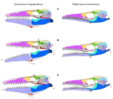 Cranial kinesis between Tylosaurus and Plotosaurus; A. resting B. protracting C. retracting positions