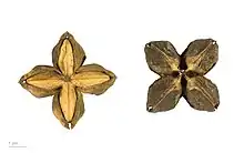 The fruits are capsules of 3 to 5 cm in diameter with 4 to 7 points, are green and ripen blackish brown. On ripening, the fruits contain a soft black wet pulp that is messy and inedible, so are normally left to dry on the plant before harvest. By two years of age, often up to a hundred dried fruits can be harvested at a time, giving 400 to 500 seeds a few times a year. Fruit capsules usually consist of four to five lobes, but some may have up to seven. Inside are the seeds, oval, dark-brown, 1.5 to 2 cm in diameter with a mass of 45 to 100 grams. The cotyledons are open, similar to those of almonds, and covered with a whitish film. Raw seeds are inedible, but roasting after shelling makes them palatable.