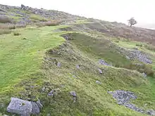 A sleeper block near King's Tor - ↑ The original Act had stated that the northern terminus was to be at Bachelor's Hall, an agricultural store built by Tyrwhitt. The Hall is still in existence: it is about 1 km east of Princetown, but it is at a considerably lower altitude; in fact an incline on a gradient of 1 in 8 would probably have been required to reach it. It appears that this aspiration was quietly dropped. An 1850 map reproduced by Kingdom in The Princetown Branch indicates a mine at this location, and Harris refers to it as a small-scale tin mine.[13]