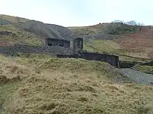 The trackbed then moves to the south side of the road into a wooded section and can easily be followed for some distance before it rejoins the road at a white cottage. It then moves to the north of the road and adjacent to a sharp bend in the road is a deep cutting. Beyond this, the trackbed again moves to the south side of the road and can be easily followed to the remains of Bwlch Glas mine. Part of the mine structures were built over the remains of the trackbed as the mine was expanded and operated after the tramway closed.