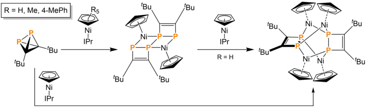 tBu2C2P2 can also be dimerized using nickel complexes to form a variety of exotic structures. tBu2C2P2 reacted with 1 equivalent of Ni(CpR)(IPr) (IPr = 1,3-bis(2,6-diisopropylphenyl)imidazolin-2-ylidene, R = H, CH3, 4-(CH3CH2)-C6H4) generates 0.5 equivalent of a tetracyclo-compound. Upon addition of another equivalent of the same nickel complex, a butterfly-like geometry is adopted, with two nickel atoms coordinated to opposite phosphorus atoms and two coordinated to adjacent phosphorus atoms on different four membered rings. This butterfly-structured compound is a dark red color. The reaction to the butterfly structure is believed to depend on kinetic access to the middle P-P bond. Bulky substituents on CpR kinetically hinder the P-P bond cleavage and transformation into the butterfly-structured product.