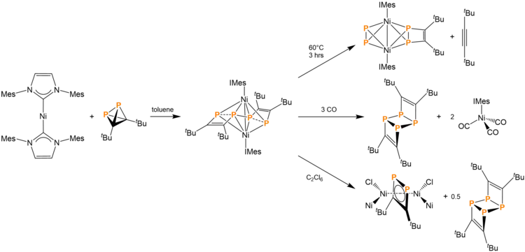 tBu2C2P2 can also be reacted with Ni(IMes)2 (IMes = 1,3-bis(2,4,6-trimethylphenyl)imidazolin-2-ylidene) in toluene to produce 0.5 equivalents of an asymmetric compound with two hexacoordinate Ni atoms, a Ni-Ni bond, and two weak P-P interactions. This product is an intermediate for further chemistry. Heating the product at 60 °C for 3 hours causes the expulsion of a di-tert-butylacetylene and the reformation of P-P bonds. Another reaction pathway involves the addition of 3 equivalents of CO to the product, leading to the production of Ni(IMes)(CO)3 and the ladderane-like compound described at the beginning of this section. A third reaction pathway involves the addition of hexachloroethane. This produces a 1,2-diphosphocyclobutadiene ring (vide supra) that is coordinated to both nickel atoms. This third reaction pathway also produces the ladderane analogue.[14]