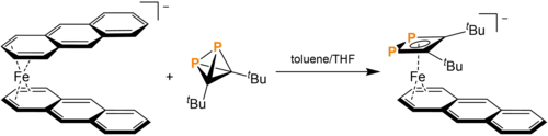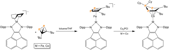 In solution with coordination complexes, tBu2C2P2 can cause ligand substitution. Most of these reactions cause cage-opening. The reaction of tBu2C2P2 with [K([18]crown-6)][Fe(anthracene)2] in toluene and THF causes the expulsion of one anthracene and the cage opening of tBu2C2P2 to form the replacement 1,2-diphosphacyclobutadiene ligand. This cage opening is due to P-C bond cleavage. Mono-ligand substitution is also observed in the reaction of tBu2C2P2 with [(DippBIAN)M(COD)] (Dipp = 2,6-diisopropylphenyl, BIAN = bis(arylimino)acenaphthene, M = Fe, Co). The cobalt product, upon reaction with Cy2PCl (Cy = cyclohexyl), forms a 1,2,3-triphospholium ligand. tBu2C2P2 can also displace the toluene in Ni(toluene)(IPr). Toluene is replaced by the aforementioned ladderane analogue in a η2-fashion.[15]