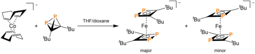 Double-ligand substitution is seen in the reaction of tBu2C2P2 with [Co(COD)2][K(THF)0.2]. The major product has its ligands doubly substituted by 1,2-diphosphacyclobutadiene. A minor product with double substitution by 1,3-diphosphacyclobutadiene ligand is also observed. However, the cobalt complex with one 1,2-diphosphacyclobutadiene ligand and one 1,3-diphosphacyclobutadiene ligand is not observed; this is likely due to steric clash between the tert-butyl substituents. The preference for 1,2-diphosphacyclobutadiene makes tBu2C2P2 a potentially valuable retron as phosphalkynes are known to produce 1,3-diphosphacyclobutadiene.[15]