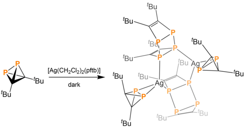 Only two of tBu2C2P2's ligand substitution reactions are known to preserve the tetrahedral cage. Reacting (pftb)[Ag(CH2Cl2)2] (pftb = Al[PFTB]- = Al[OC(CF3)3]4-) with tBu2C2P2 in lightless conditions leads to the generation of a disilver complex wherein each of the two tBu2C2P2 ligates to one silver atom and each of the two ladderane analogues (vida infra) ligates to both silver atoms.[4] By reacting Ni(CO)4 in THF at –80 °C and in the absence of light, three tBu2C2P2 molecules coordinate to Ni in an η2-fashion. Calculations by Intrinsic Bond Orbital (IBO) theory suggest that the coordination occurs through a 3-center-2-electron bond.[16]