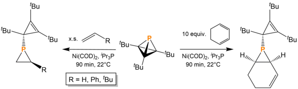 The addition of 0.2 equivalents of triphenylborane in benzene can produce several cycloadducts. In the absence of exogenous reagents, tBu3C3P dimerizes into a ladderane-like compound with a P-P bond. In the presence of excess styrene or an atmosphere of ethylene, [4 + 2] cycloadditions occur to give 1-phosphabicyclo[2.2.0]hexenes.[11]