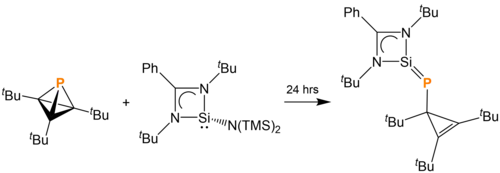 The cage opening of tBu3C3P can be induced by PhC(NtBu)2SiN(SiMe3)2 over the course of 24 hours to generate the dark red phosphasilene PhC(NtBu)2Si=P(tBu3C3).[13]