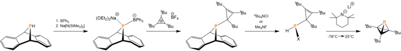 The original synthesis of tBu3C3P reported by Cummins and coworkers in 2020 begins with the phosphorus derivative of anthracene. The addition of sodium hexamethyldisilazide deprotonates the phosphorus followed by triphenylborane then bonding to the phosphorus. The anionic phosphorus-containing intermediate then forms an ionic interaction with the sodium cation in solution. The addition of tri-tert-butyl cyclopropenium ion produces the thermally stable cyclopropenyl phosphine intermediate. Upon irradiation with 254 nm light in the presence of triflic acid and either tetra-n-butyl ammonium chloride or tetramethylammonium fluoride, the anthracene leaving group is forced out, leaving a halogenated phosphine. Upon addition of lithium tetramethylpiperidide with heating, tBu3C3P and lithium halide salt is generated.[3]