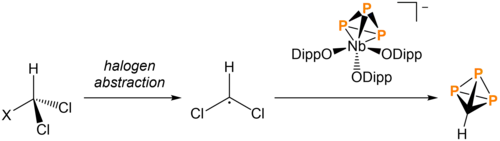 Cummins and coworkers reported the synthesis of HCP3 in 2021. Due to the similarity of HCP3 to AsP3, the [NbII(ODipp)3(P3)]- previously shown to be a retron for AsP3 was used for the synthesis of HCP3. To add a -CH group to [P3]3-, bromodichloromethane undergoes halogen abstraction, leaving a carbon-centered radical. The niobium complex then undergoes P3 transfer to yield HCP3. The use of bromodichloromethyl trimethylsilane instead of bromodichloromethane in this process yields trimethylsilyl triphosphatetrahedrane ((Me3S)CP3).[5][12]