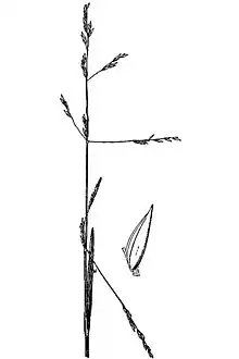 Poa bolanderi is a species of grass known by the common name Bolander's bluegrass. It is native to western North America from British Columbia to Utah to California, where it is a resident of mountain habitat, particularly pine and fir forests. It is an annual grass growing in clumps up to 60 centimeters tall. The inflorescence occupies the top 10 to 15 centimeters of the stem. It is narrow in flower, with branches appressed, growing parallel to the stem. As the fruit develops the branches spread out, becoming perpendicular to the stem, nodding, or drooping. The branches have few, sparse spikelets.