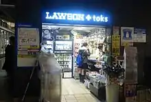A hand written sign advertising "Pocky Day" (left), in front of a small Japanese convenience store