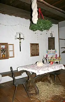 In Slovakia, the ornament called polazňička was also known – it was a straw hen (e.g. in the upper Spiš region, where it was hung over the Christmas table), which symbolically corresponded to a green conifer ornament,[13] Christmas tree,[14] or a branch of coniferous tree brought by a polaznik.[3] This was also the name of the ritual Christmas bread.[3] In the Slovak-Moravian borderland, polazňička was called "happiness", which is related to the Polish belief that podłaźniczka brings good luck.[11]