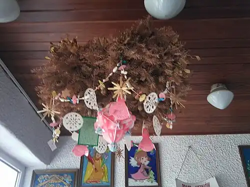 They were usually decorated with hand-made decorations made of tissue paper or colored paper.[10] They were also decorated with the so-called światy "worlds", which were pieces of christmas wafer joined together. The wafer was used to make various shapes, such as crosses, suns, crescents, etc.; they were also often colored. They were made on the day of Christmas Eve (Polish: Wigilia (Bożego Narodzenia)), which gave rise to another name for this ornament: wilijki.[5] Sometimes the światy became an independent decoration,[8] in which case they were hung under the ceiling beam.[5] Moreover, the podłaźniczka was decorated with candies, apples, cookies,[10] nuts, or gilded flax seeds,[5] and after World War II also with baubles.[10] Before the appearance of the modern Christmas tree straw a pająk "spider" was a similar decoration.[9]