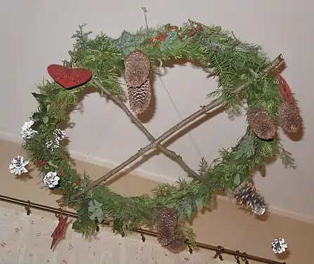 In Poland, the podłaźniczka was known mainly in the Goral Lands.[7] The podłaźniczka was made in various ways, it could be a conifer tree,[8] or conifer tree treetop[9] turned upside down, a branch of a conifer,[5] or a riddle (przetak) ring to which green twigs were attached.[5] So prepared decoration was attached to the beam,[8] often directly above the Christmas table,[8] or in a sacred corner.[9] Podłaźniczka is considered to be the prototype of modern Christmas tree in Poland.[10]